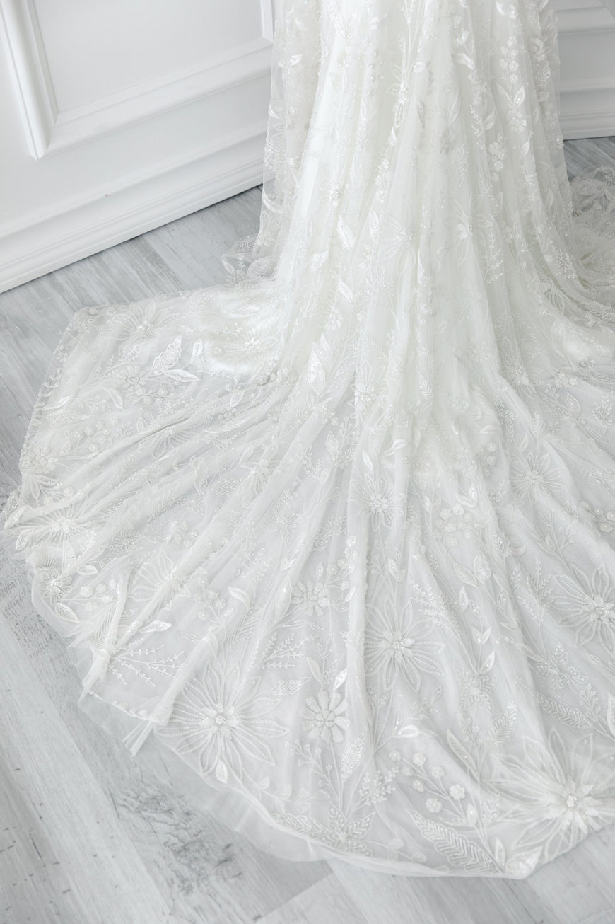 ✔ Fully Embroidered Lace Fabric: Exquisite floral lace covering the entire gown.