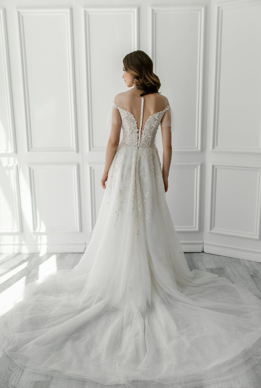 Designed for romantic brides, this off-the-shoulder wedding dress features a beaded lace bodice, soft tulle skirt, and delicate sheer sleeves, creating an ethereal and enchanting bridal look.