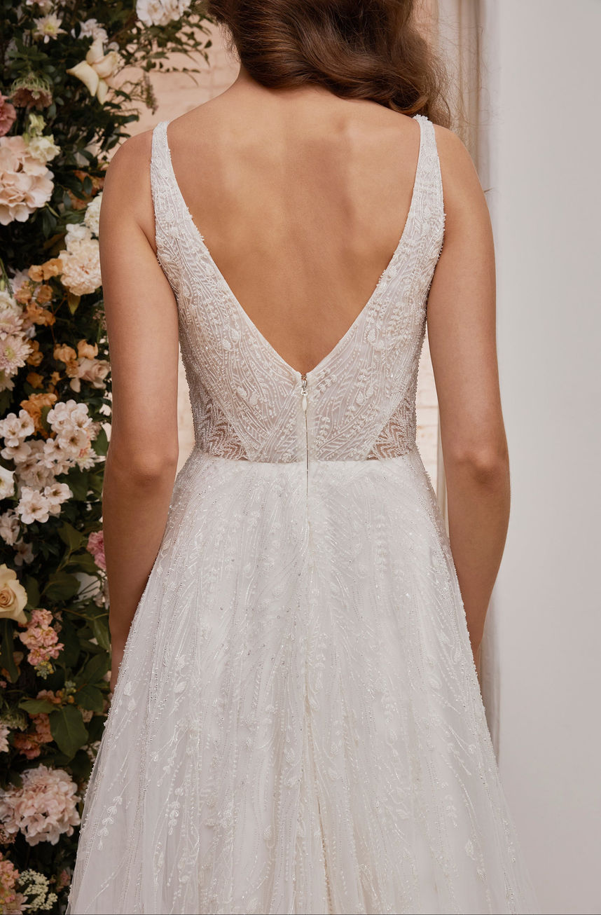 Make an unforgettable entrance in this luxurious satin ballgown wedding dress. Featuring a beaded lace bodice, deep V-neckline, and voluminous satin skirt, this gown embodies modern royalty. Designed for brides who dream of a sophisticated and glamorous wedding, this style blends timeless tradition with contemporary bridal fashion.
